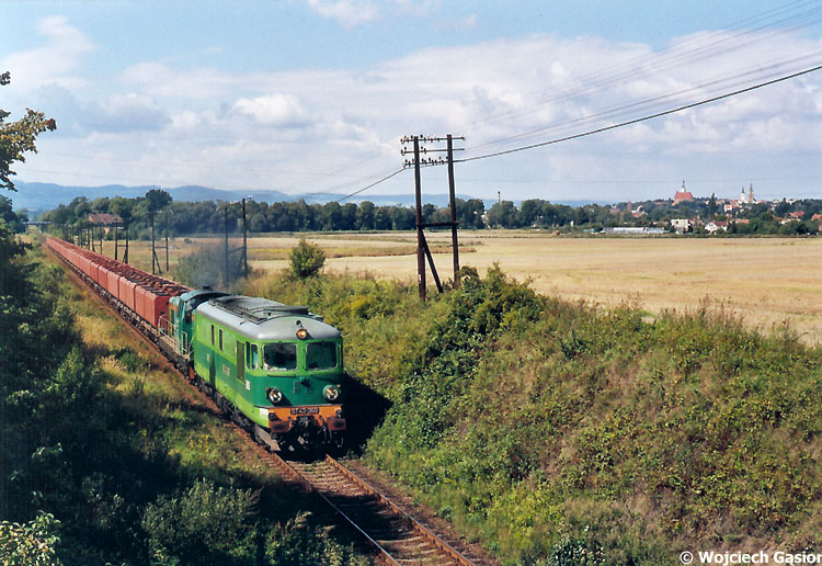 Szlak Dzierżoniów - Piława Górna. Skład towarowy prowadzą ST43-368 i SM42-470. W tle widzimy Góry Sowie oraz zabudowania Dzierżoniowa.