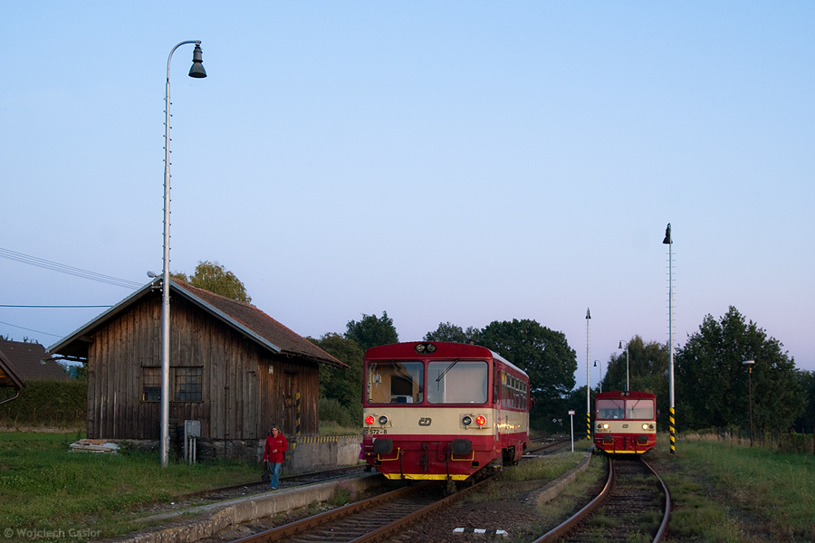 | wykonano | 26.09.2011 | Krzyżowanie na stacji Kasejovice odbywa się w rozkładzie jazdy 2010/2011 pięć razy w ciągu doby, tylko w dni robocze. Na zdjęciu znalazło się to z godziny 19. 810 572-8 wykonuje kurs 27912 relacji Nepomuk - Blatná, 810 177-6 jedzie zaś jako pociąg 27917 relacji przeciwnej. |