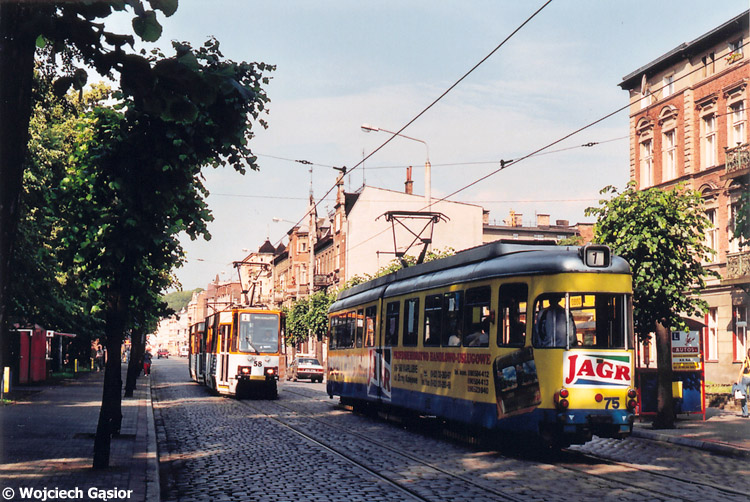 Ul. Legionów. Na mijance na trasie do Tarpna spotkało się 50% taboru tramwajowego będącego tego dnia w ruchu: GT6 75 i 805Na 58+41.