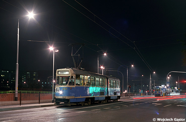 102Na 2003 podczas krótkiego postoju na przystanku przy Moście Osobowickim - pierwsza próba ”szybkiego” nocnego zdjęciowania zakończyła się pełnym sukcesem - nawet tramwaj wpasował się idealnie między słupy :).