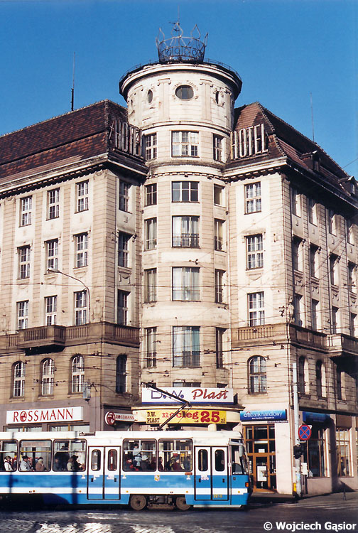 Ul. Piłsudskiego / Kołłątaja. 105NWr 2218 (w składzie z 2219) mija D.W. Piast - ulubiony obiekt noclegowy warszawskich studentów na tej dolnośląskiej prowincji.