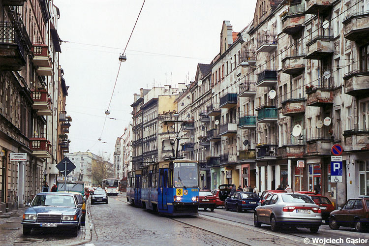 Objazdowa trójka (105Na 2282+2283) sunie po przedwojennych szynach ulicą Kościuszki w kierunku Księża Małego.