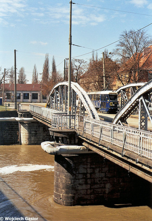 102Na 2028 przejeżdża przez stary, używany jedynie przez pieszych i tramwaje awaryjne, Most Mieszczański. W lewym dolnym rogu widać cień nowego mostu o tej samej nazwie, którym prowadzony jest normalny ruch kołowy i tramwajowy.