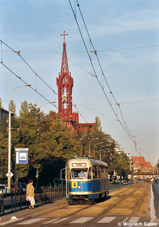 102Na 2068, ul. Grabiszyńska. Na zdjęcie załapały się dwa kościoły: Św. Elżbiety (z widoczną wieżą) oraz, na horyzoncie, Św. Doroty.