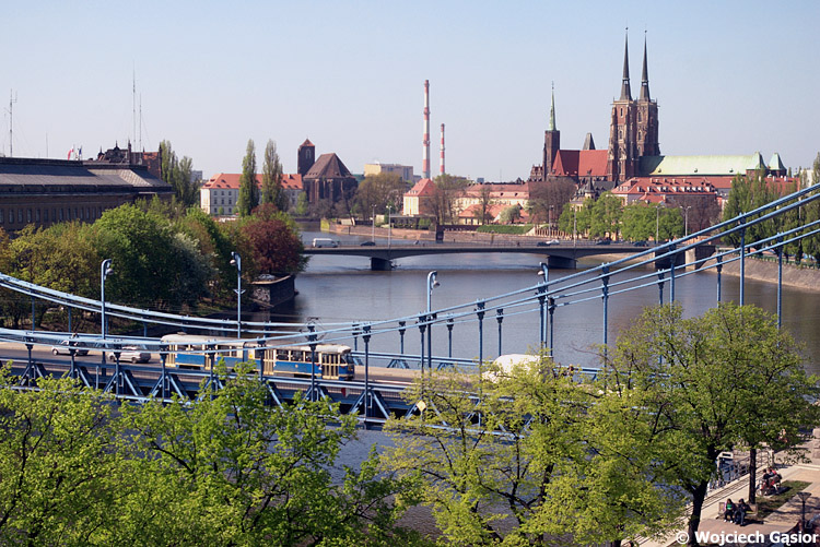 102Na 2027 na Moście Grunwaldzkim. Dalej widoczne są Most Pokoju i Ostrów Tumski oraz nieodzowny element panoramy Wrocławia - kominy elektrociepłowni.